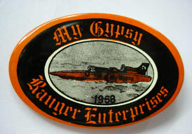 1968 MY GYPSY RANGER ENTERPRISES hydroplane pin. Oval shape. 1.75" by 2.75" celluloid pinback button. backside is clean; no rust . 8.00