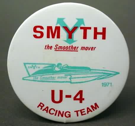1971 SMYTHE THE SMOOTHER MOVER U-4 RACING TEAM. turquoise and red on white. 2.25" diameter celluloid pinback. near mint to mint. no flaws. 7.50
