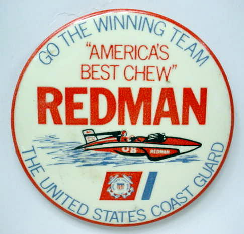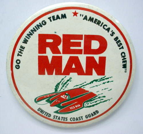 1973 issue. GO THE WINNING TEAM - "AMERICA'S BEST CHEW" REDMAN - THE UNITED STATES COAST GUARD. large 4" celluloid pinback button. backside is clean; no rust. 4.50