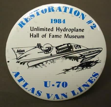 pin. SPIRIT OF DETROIT ASS'N. GOLD CUP RACE ATLAS VAN LINES BOOSTER with illustration of the boat. June 25; 1972. Detroit Mich. blue on white. celluloid pinback button. rectangular shape. approx. 2" by 3". near mint to mint. no flaws. 6.00