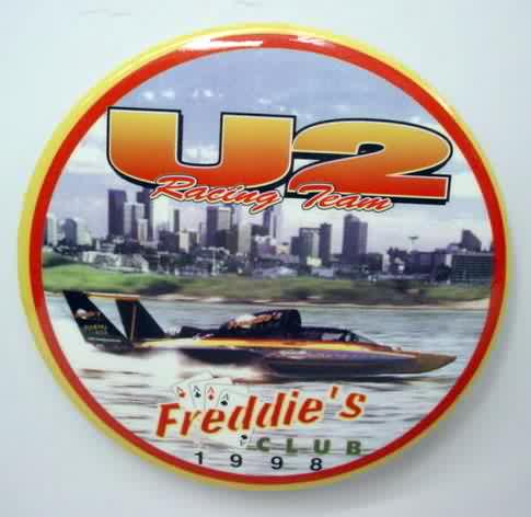 pin. 1998 U-2 FREDDIE'S CLUB RACING TEAM. 3" diameter celluloid pinback button. backside is clean; no rust. mint. 5.00