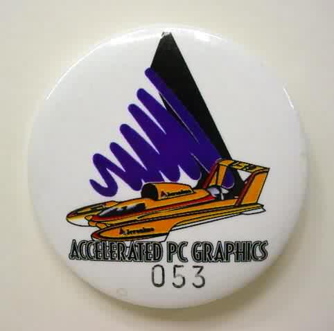 1996 ACCELERATED PC GRAPHICS hydroplane pinback. Limited Production; serial numbered 053. 2.25" diameter celluloid. reverse is clean; no rust. colors are strong and vivid. No flaws! superior condition. sorry sold