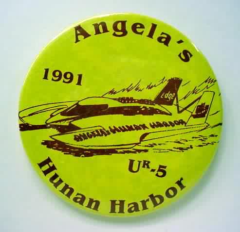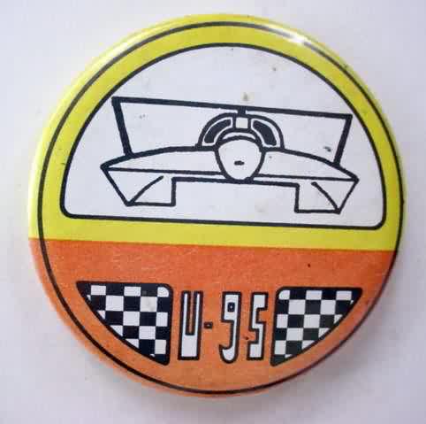 1999 U-95 hydroplane pinback button. orange; yellow; black on white. 2.25" diameter celluloid. Reverse is clean; no rust. colors bright and vivid. no flaws. near mint. sorry sold