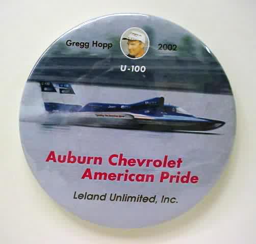 2002 AUBURN CHEVROLET AMERICAN PRIDE U-100 hydroplane pinback. photo on top of GREGG HOPP. full color action photo of the boat. 3" diameter celluloid. reverse is clean; no rust. colors are strong and vivid. No flaws. Superior condition. sorry sold