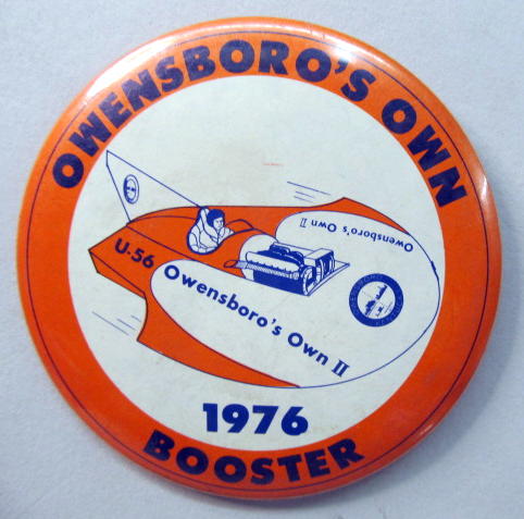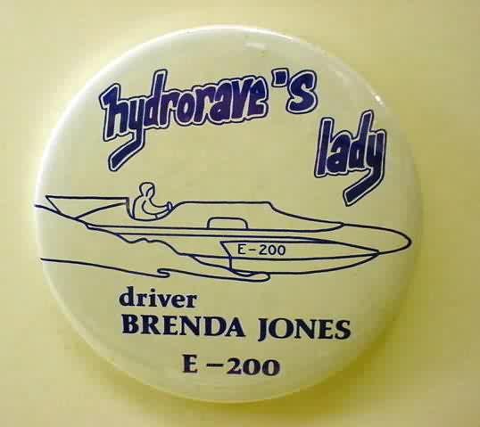 1970 Brown Deck BURIEN LADY unlimited hydroplane pinback button. The boat has a brown deck with blue cowl. The lettering is brown; the rings are blue. 2.25" diameter celluloid pinback button. colors are very strong and bright. no rust. no flaws. near mint. 15.00