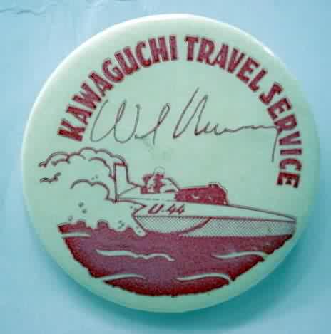 scarce 1970's MR. KILOWATT Haines Electric Hydroplane race boat pinback button. approx. 3" diameter celluloid pinback button. full color image of boat #154. Catalogued in Ned Olsoe's Hydroplane Guide. obtained from the family of Hall of Fame race driver Jim McCormick.