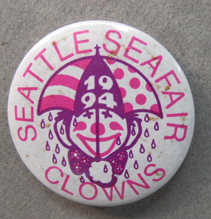 1994 SEATTLE SEAFAIR CLOWNS. red and purple on white. 2.25" diameter celluloid. manufacturing process created small "spots" in background. guaranteed NOT foxing. mint. 5.00