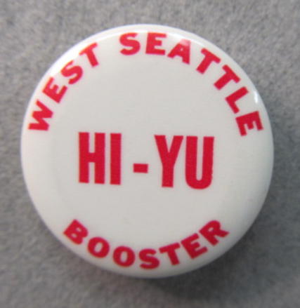 WEST SEATTLE HI-YU BOOSTER. Seafair hydroplane related. red on white. 1.25" diameter celluloid pinback button. minor surface oxidation on reverse. near mint to mint. 6.50