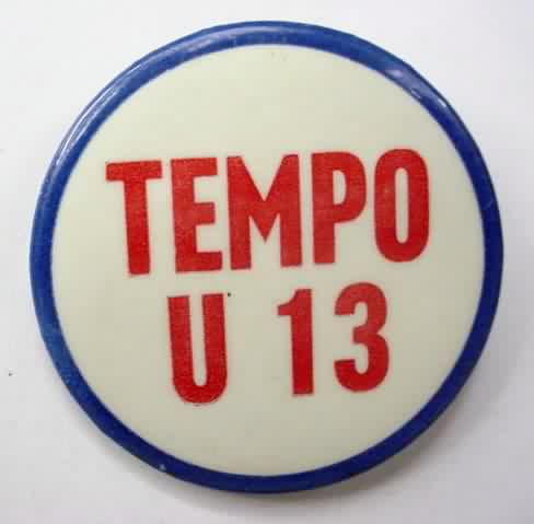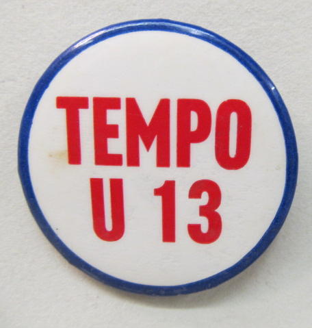 1963 TEMPO U-13 hydroplane pinback button. red & blue on white with illustration of the boat. 2" diameter celluloid. reverse is clean; no rust. colors bright and vivid. no flaws. superior condition. 22.50