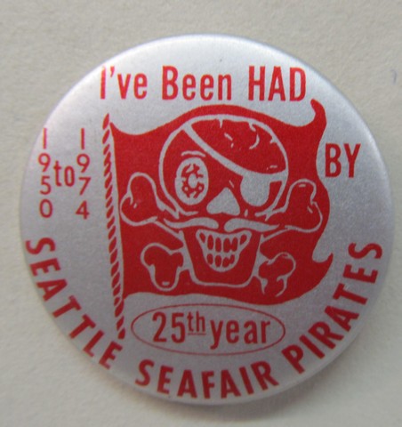 1974 SEATTLE SEAFAIR PIRATES 25th ANNIVERSARY. 2.25" diameter celluloid pinback button. near mint to mint. 8.50