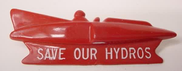 1964 Seattle SEAFAIR unlimited hydroplane race boat; SAVE OUR HYDROS figural pin. Molded hard red plastic with the wording embossed into the side in white. Approximately just shy of 2" long. Pin clasp on rear. Color is bright and vivid. Mint condition. 8.00