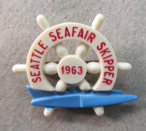 1963 SEATTLE SEAFAIR SKIPPER wheel pin. red lettering on white with blue boat. approx. 1.5" wide. mint. 10.00