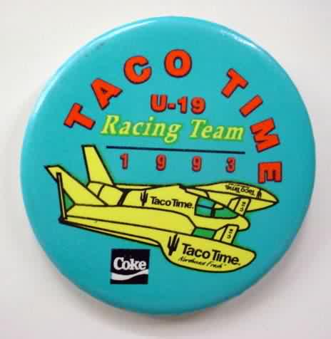 1993 TACO TIME U-19 RACING TEAM hydroplane pinback button. 2.25" diameter celluloid. Reverse is clean; no rust. colors bright and vivid. no flaws. superior condition. 5.00