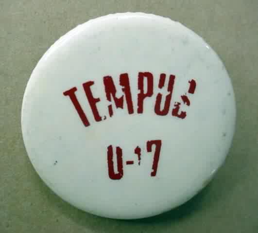 1963 TEMPO U 13 hydroplane pinback button. 2" diameter celluloid. red lettering on white with blue border. Has very faint spot at base of the "T". I shaded the photo so that it will show. It appears darker on the jpeg than it does it real life. still displays very nicely. 10.00