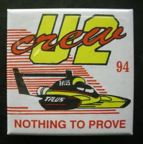 1994 T-PLUS U2 CREW NOTHING TO PROVE #94 square hydroplane pinback button. 2.125" square celluloid. reverse is clean. no rust. colors bright and vivid. no flaws. superior condition. 21.00