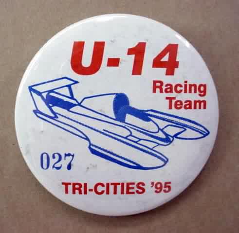 1993 U-14 RACING TEAM TRI-CITIES #027 hydroplane pinback button. Red and blue on white. 2.25" diameter celluloid. Reverse is clean; no rust. colors bright and vivid. No signs of rust but there is very light spotting in background. otherwise superior condition. sorry sold