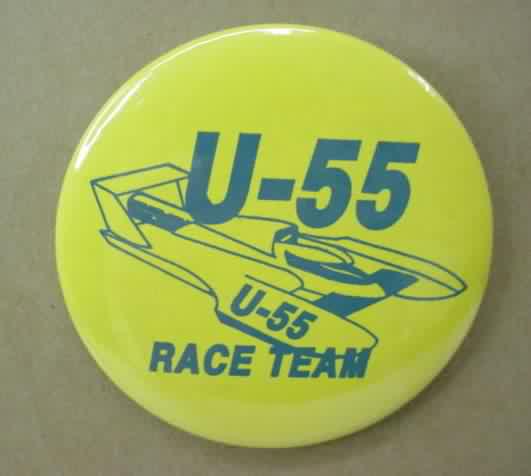 1993 U-55 RACE TEAM hydroplane pinback button. Blue on yellow. 2.25" diameter celluloid. Reverse is clean; no rust. colors bright and vivid. no flaws. superior condition. 11.00