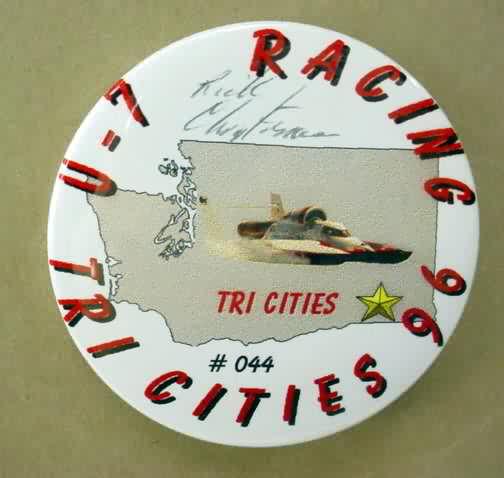 1996 U-7 TRI-CITIES #044 MAP OF WASHINGTON signed by RICK CHRISTENSEN hydroplane pinback button. the driver's signature is under the celluloid. 2.25" diameter celluloid. Reverse is clean; no rust. colors bright and vivid. no flaws. superior condition. 21.50