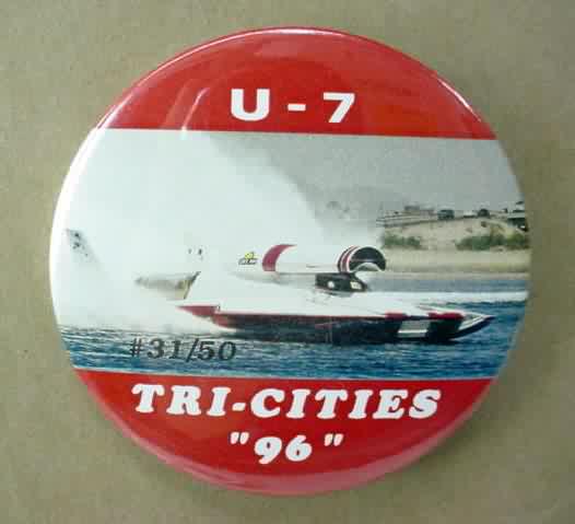 1996 U-7 TRI-CITIES #31/50 photo hydroplane pinback button. 2.25" diameter celluloid. Reverse is clean; no rust. colors bright and vivid. no flaws. superior condition. 21.50