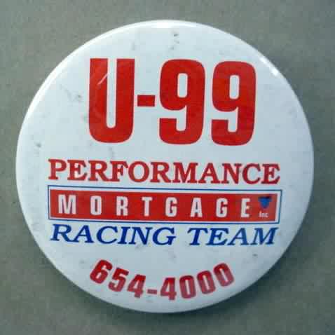 1996 U-99 PERFORMANCE MORTGAGE red hydroplane pinback button. Red letter variety - scarce; only 50 issued. 2.25" diameter celluloid. Reverse is clean; no rust. colors bright and vivid. No signs of rust but there is light spotting in background. I believe this is from poor paper quality. otherwise superior condition. sorry sold