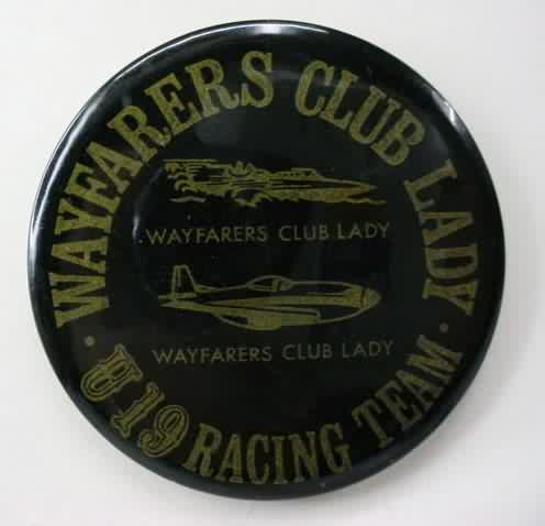 1966 WAYFARER'S CLUB LADY hydroplane pinback button. 2.5" diameter celluloid. Reverse is clean; no rust. colors bright and vivid. minor surface wear. near mint. 11.50