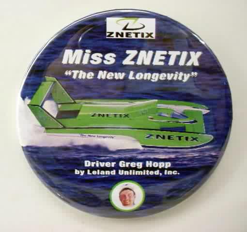 2000 MISS ZNETIX logo on top hydroplane pinback button. 3" diameter celluloid. Reverse is clean; no rust. colors bright and vivid. no flaws. superior condition. 5.00